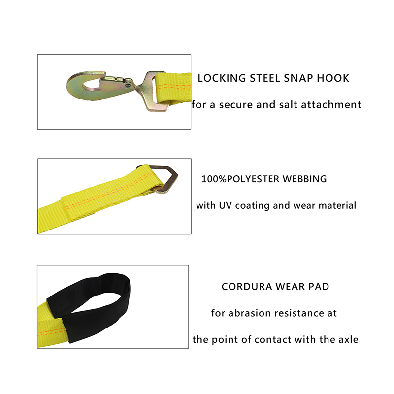 インストールが簡単。ストラップはタイヤの周りをループし、サイドレールまたはステークポケットに取り付けます。
